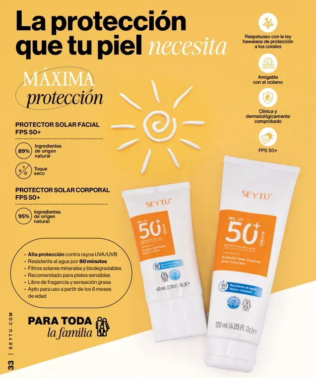 Protege tu piel diariamente con el protector solar corporal con FPS 50+, ideal para pieles sensibles, resistente al agua y libre de fragancia.